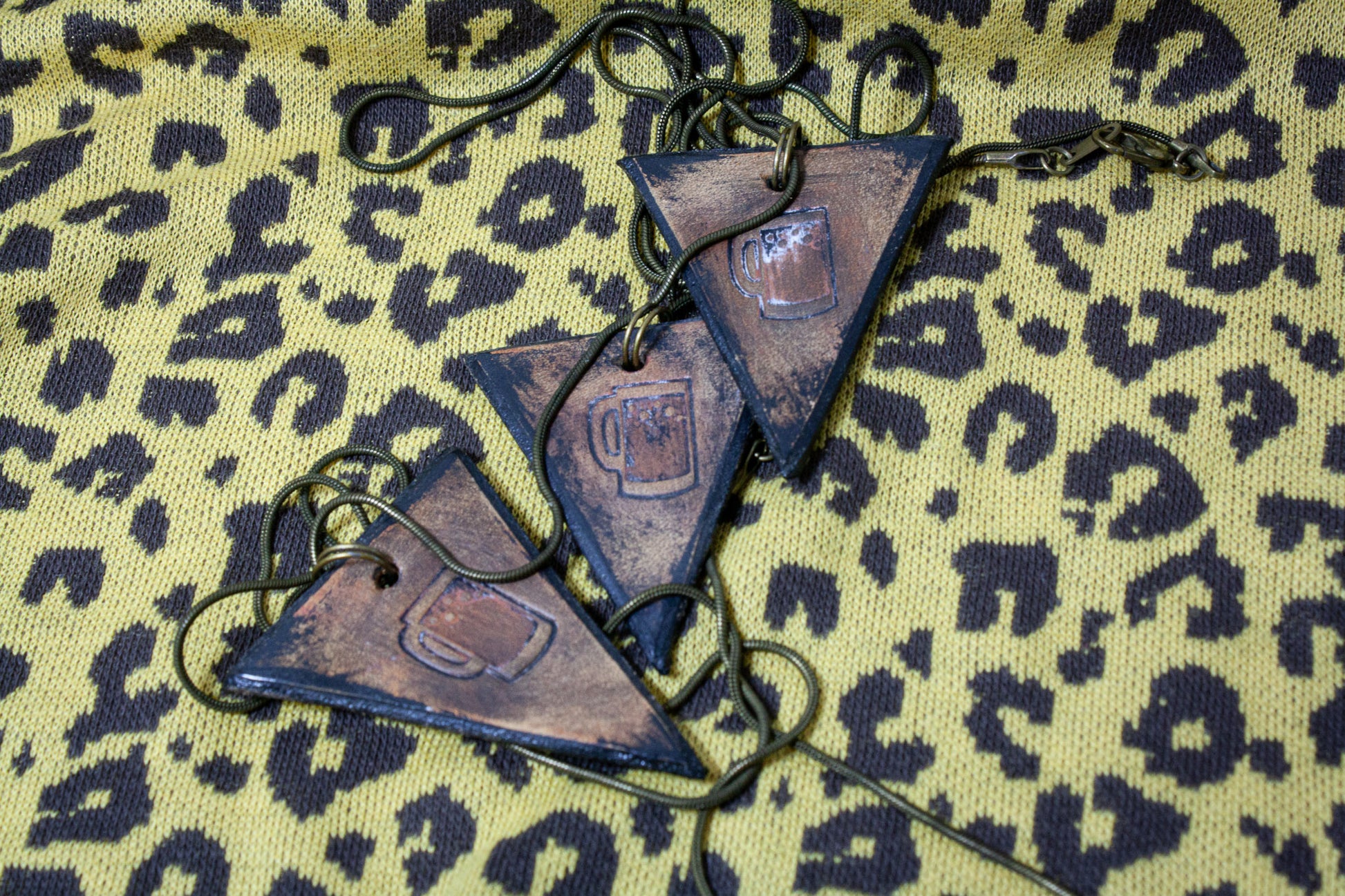 AGED BEER STEIN, LEATHER EMBOSSED NECKLACE.
