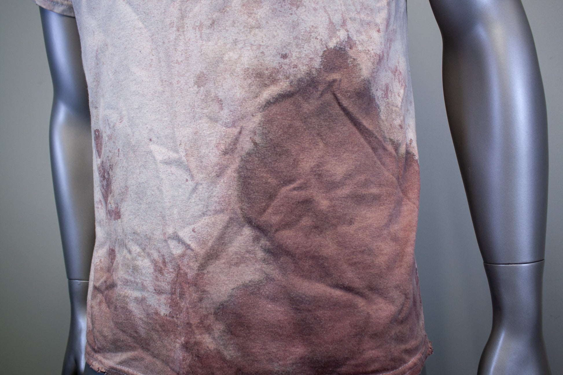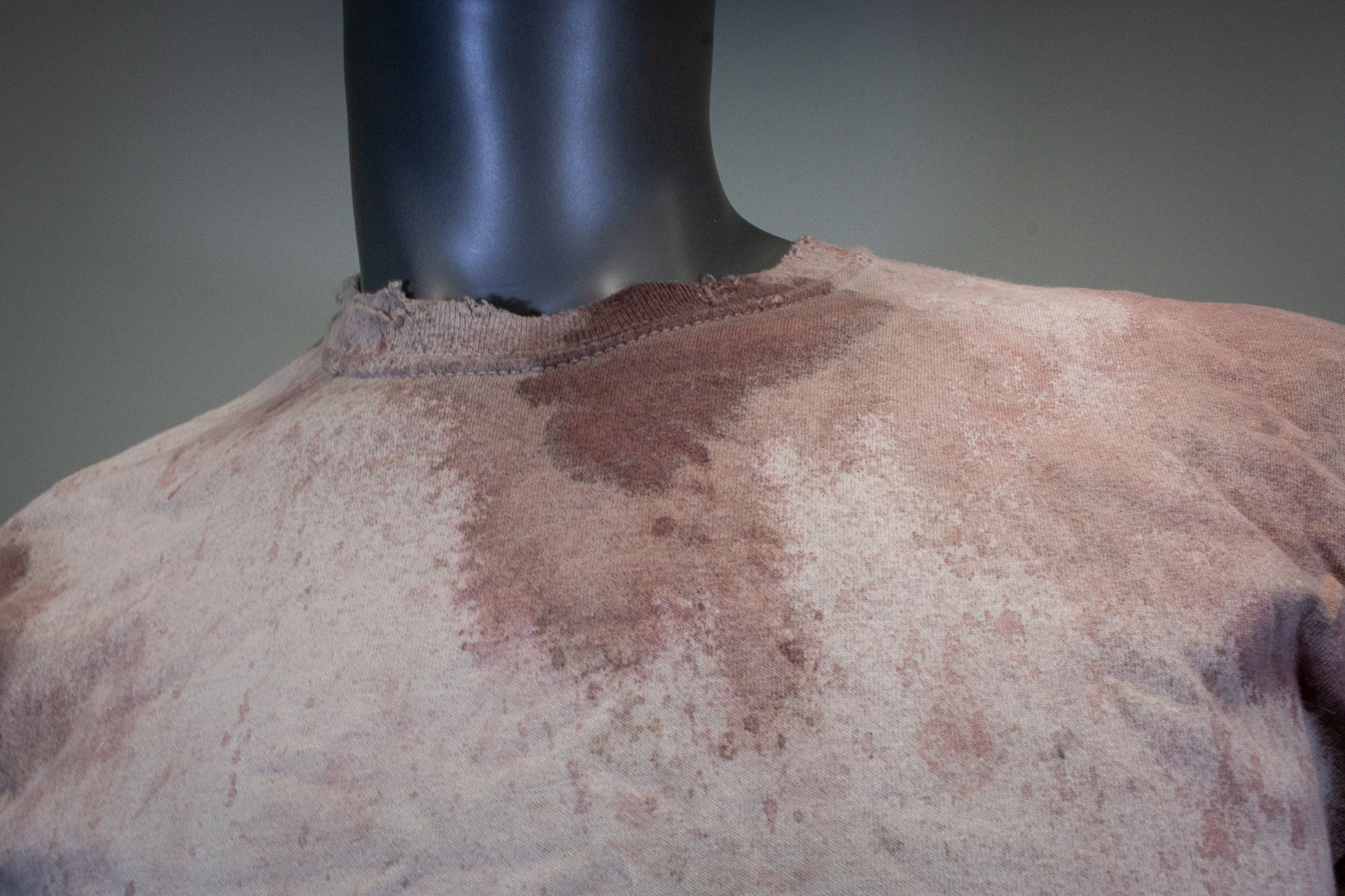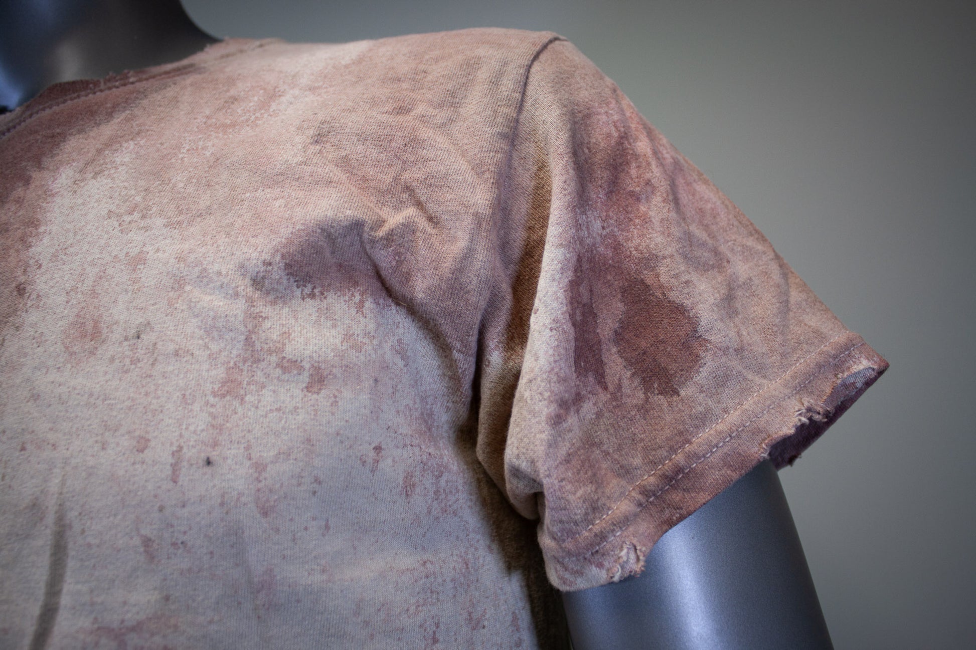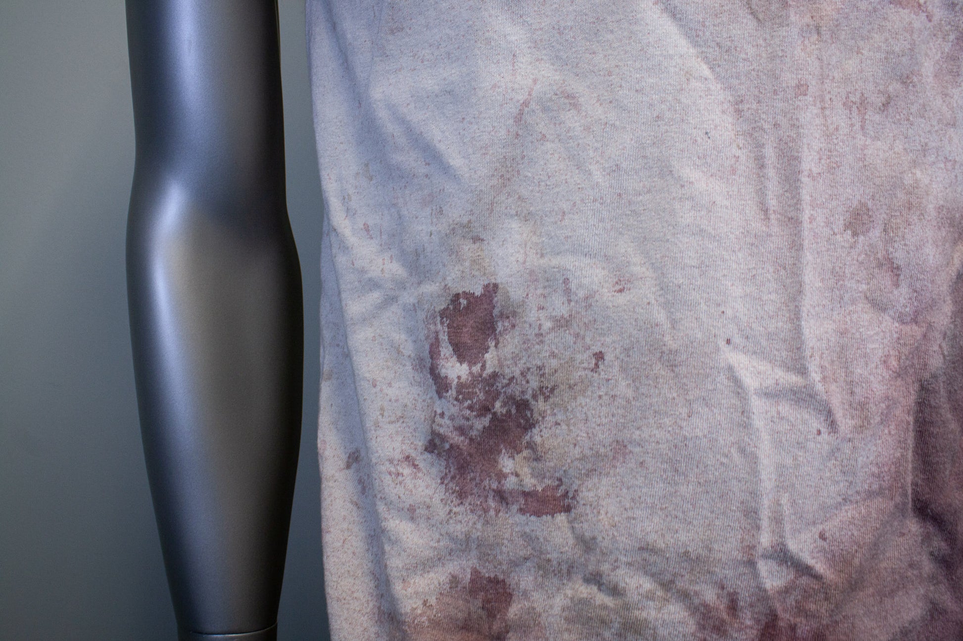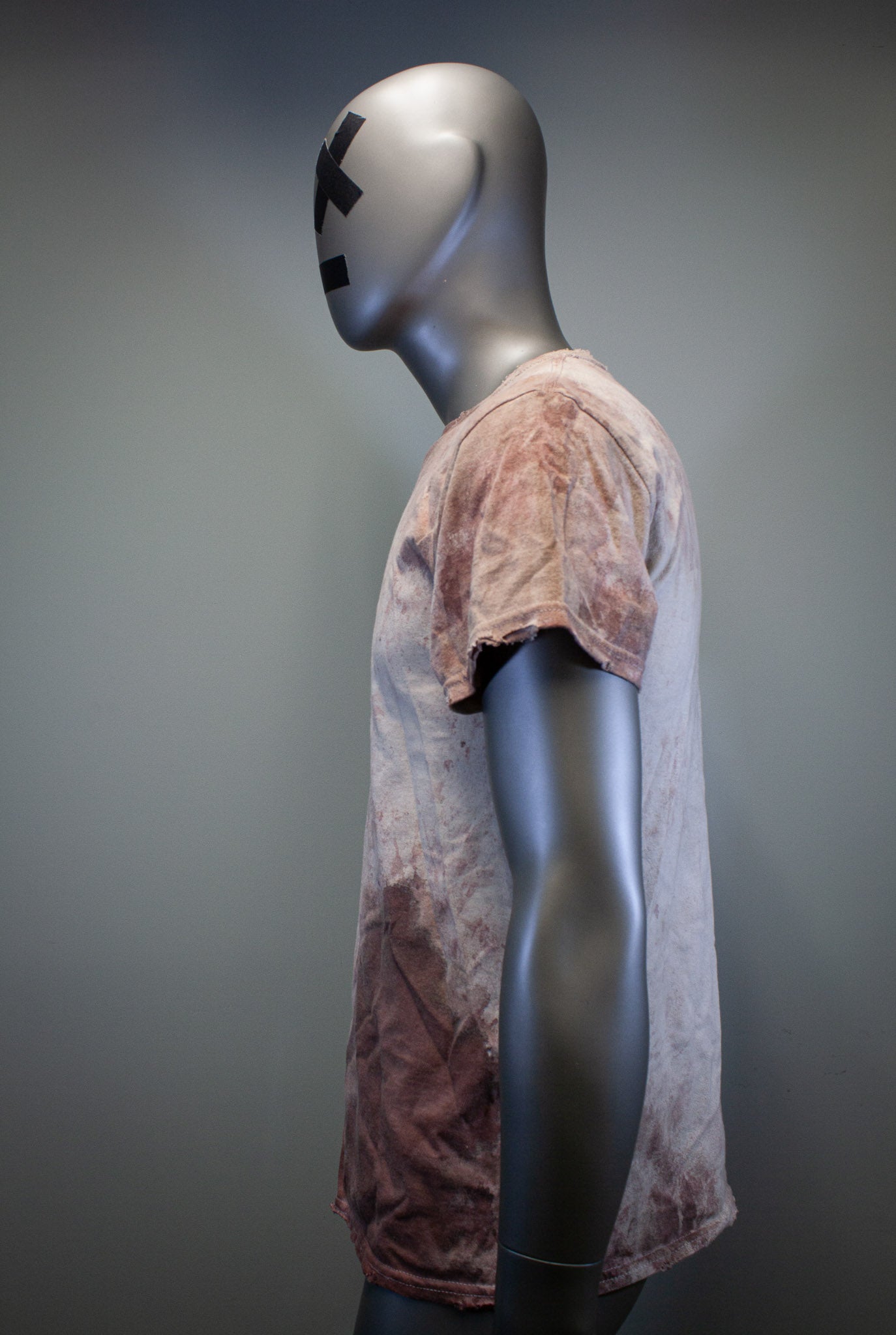 FEELS LIKE A NORMAL SHIRT, NO STAGE BLOOD IS USED; ONLY PIGMENTS, FABRIC PAINTS & DYES, WHICH ARE EMBEDDED INTO THE FABRIC TO APPEAR STAINED.
