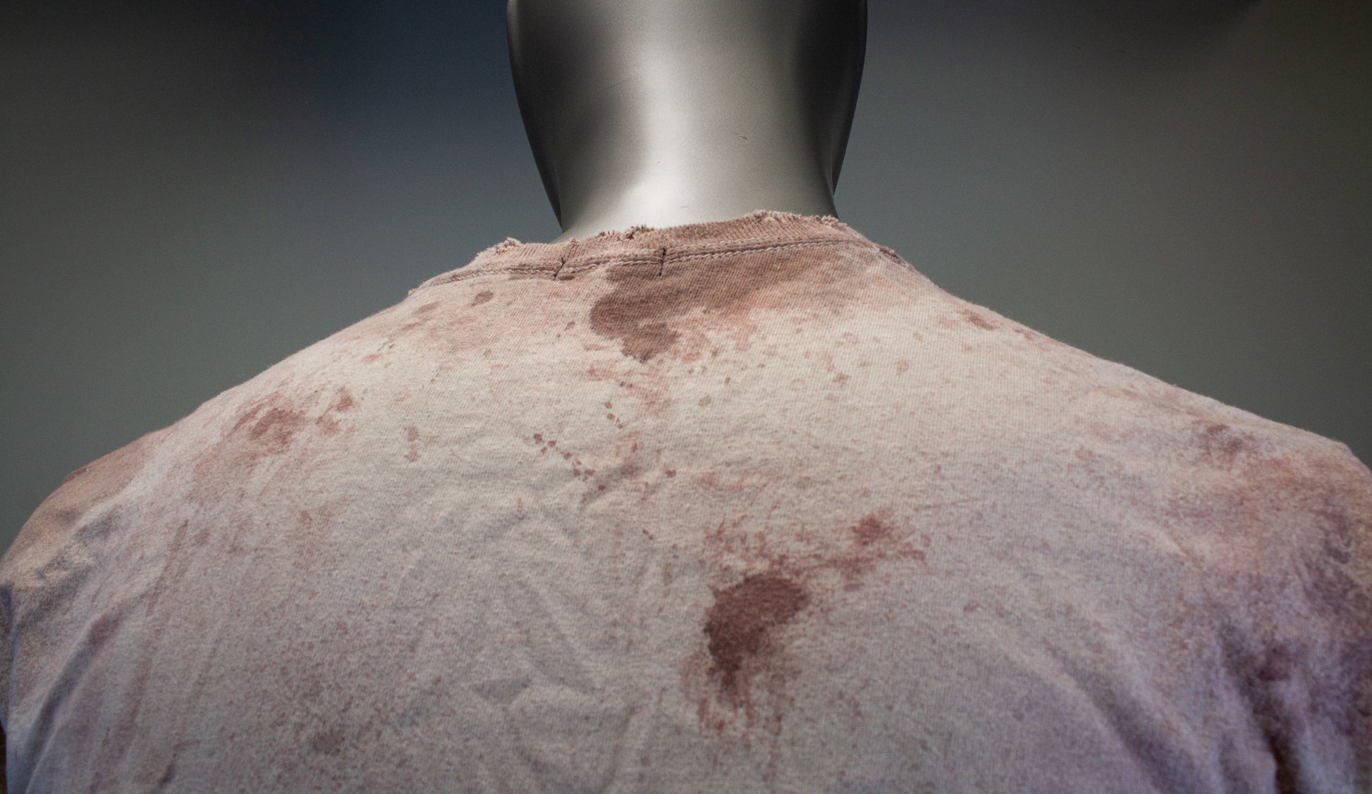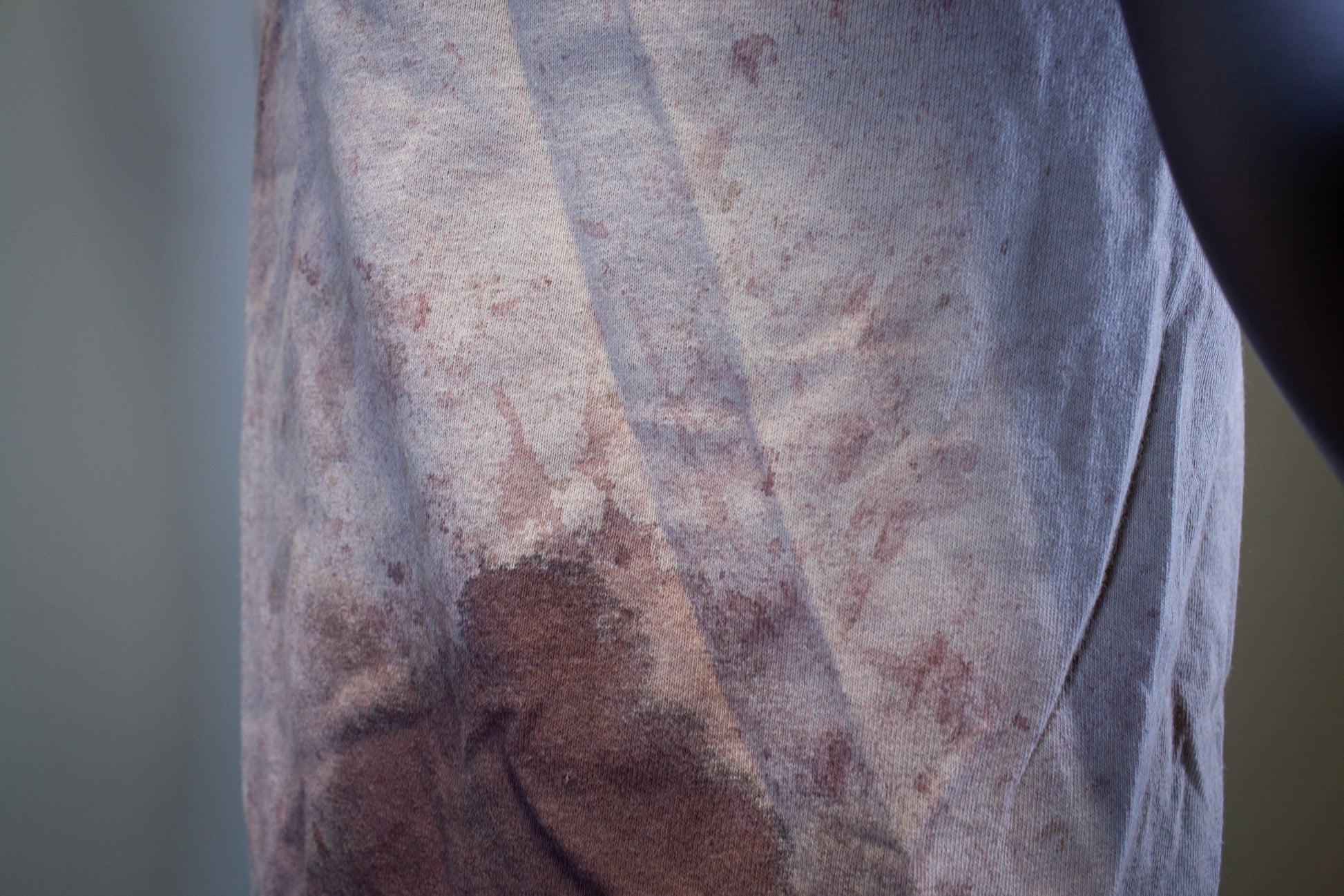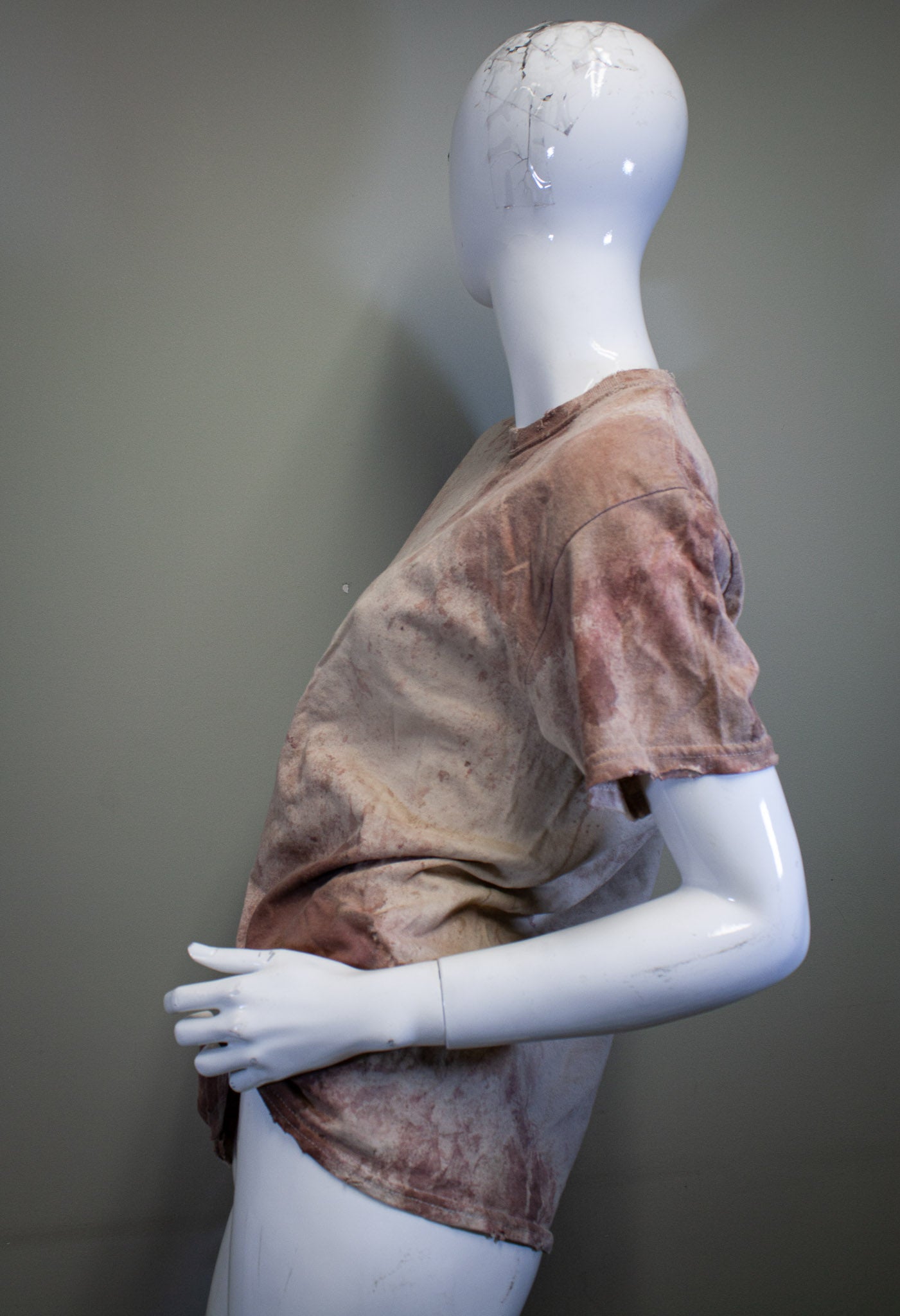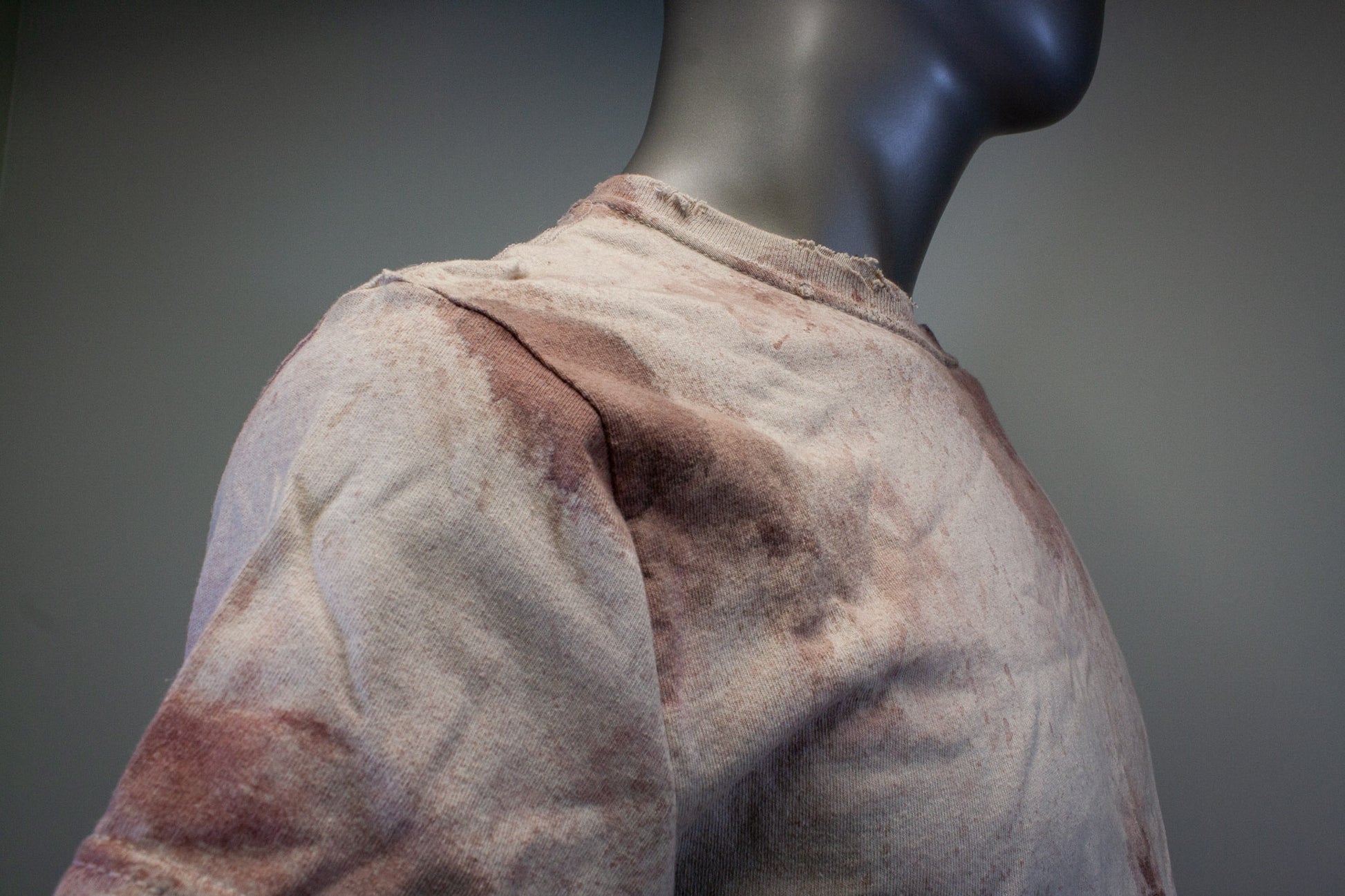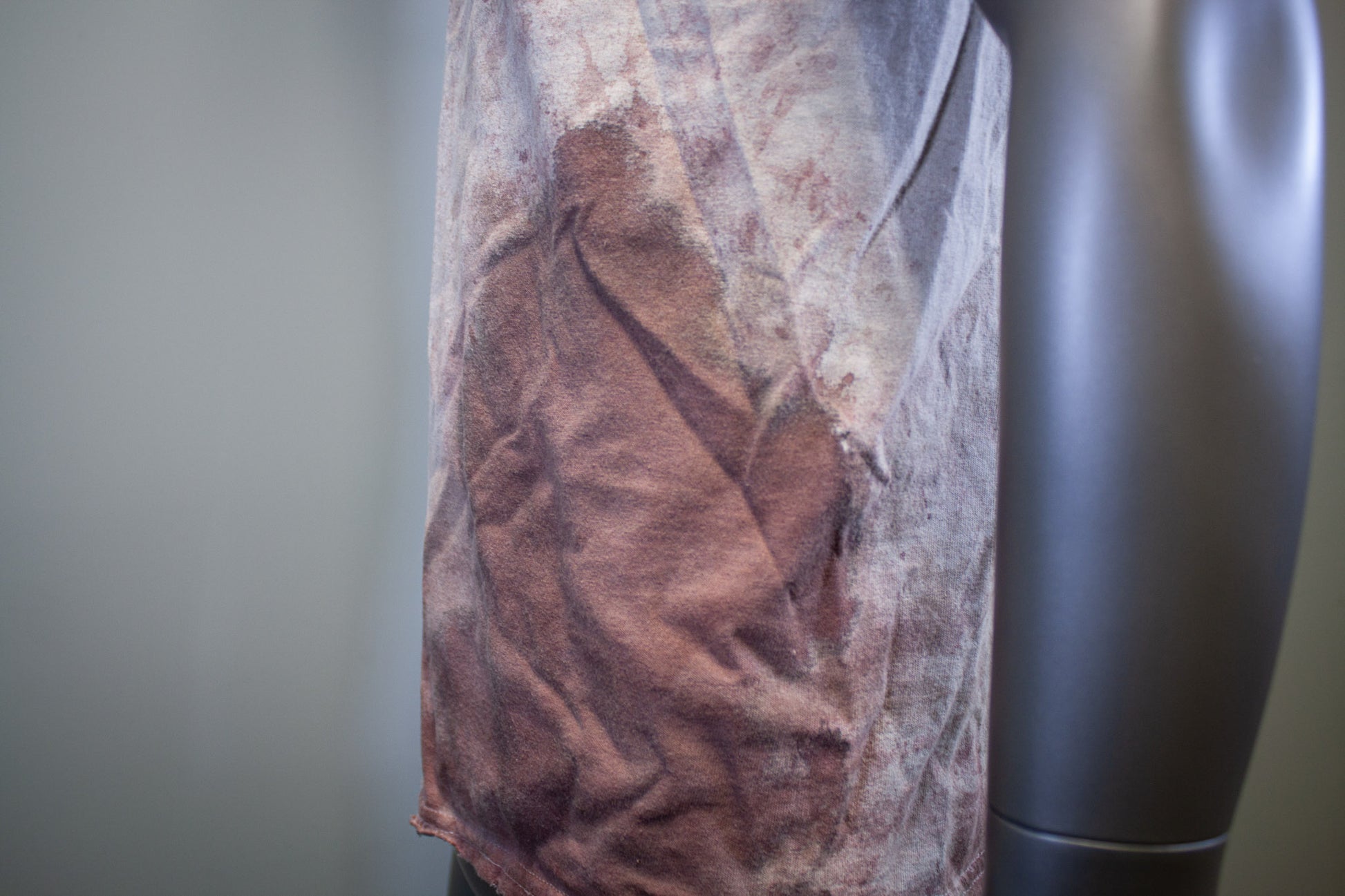 FEELS LIKE A NORMAL SHIRT, NO STAGE BLOOD IS USED; ONLY PIGMENTS, FABRIC PAINTS & DYES, WHICH ARE EMBEDDED INTO THE FABRIC TO APPEAR STAINED.