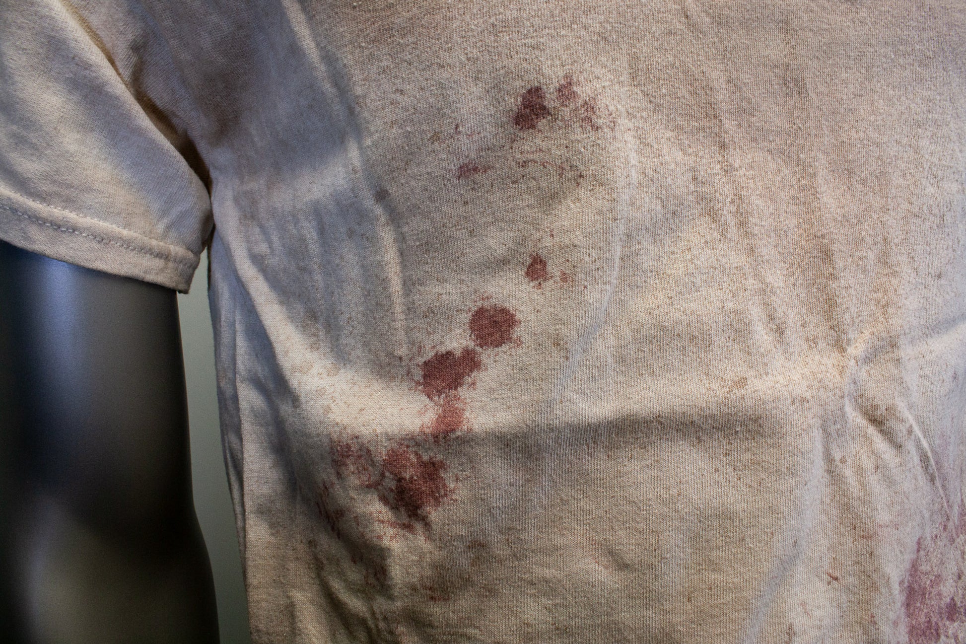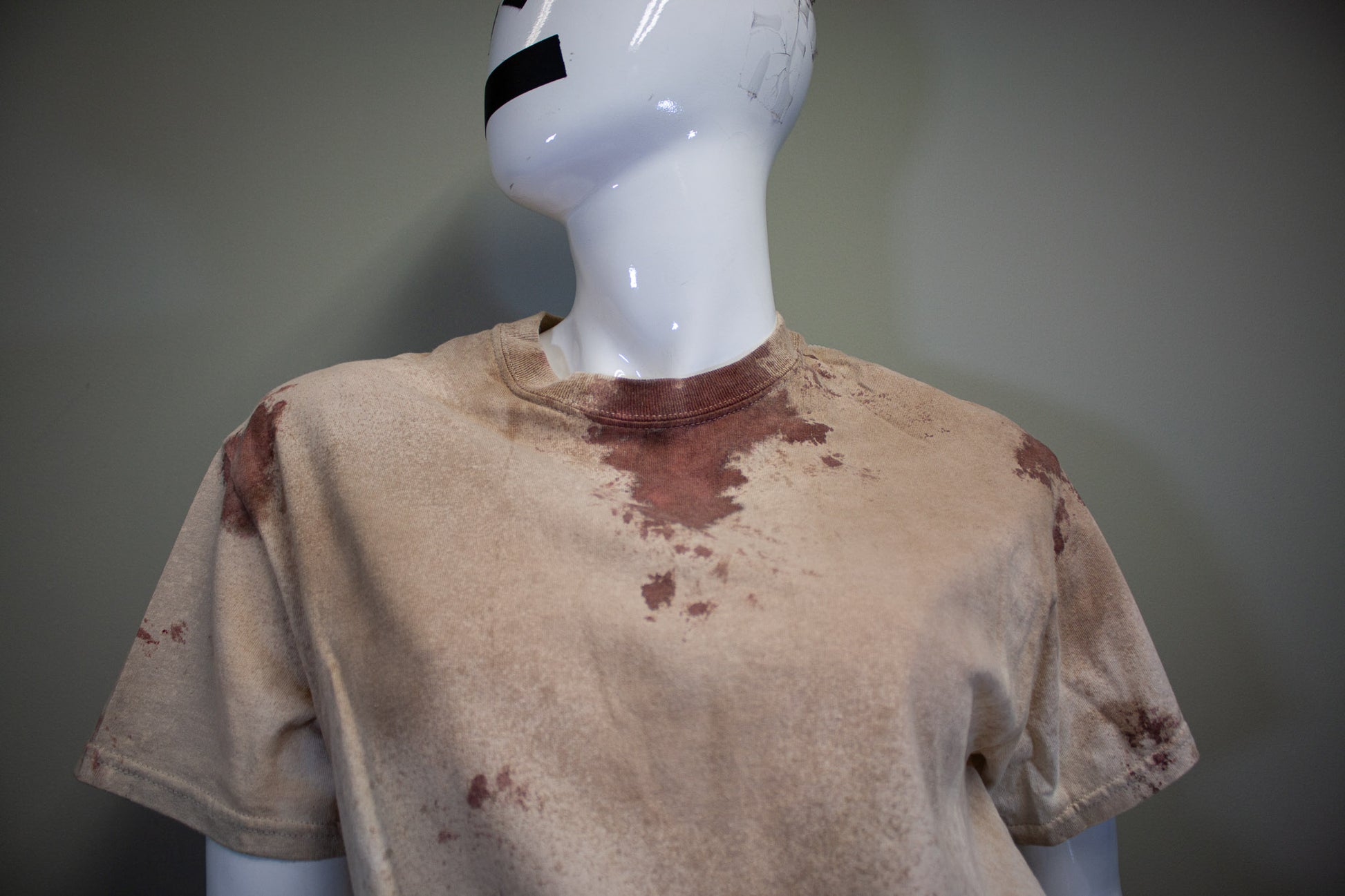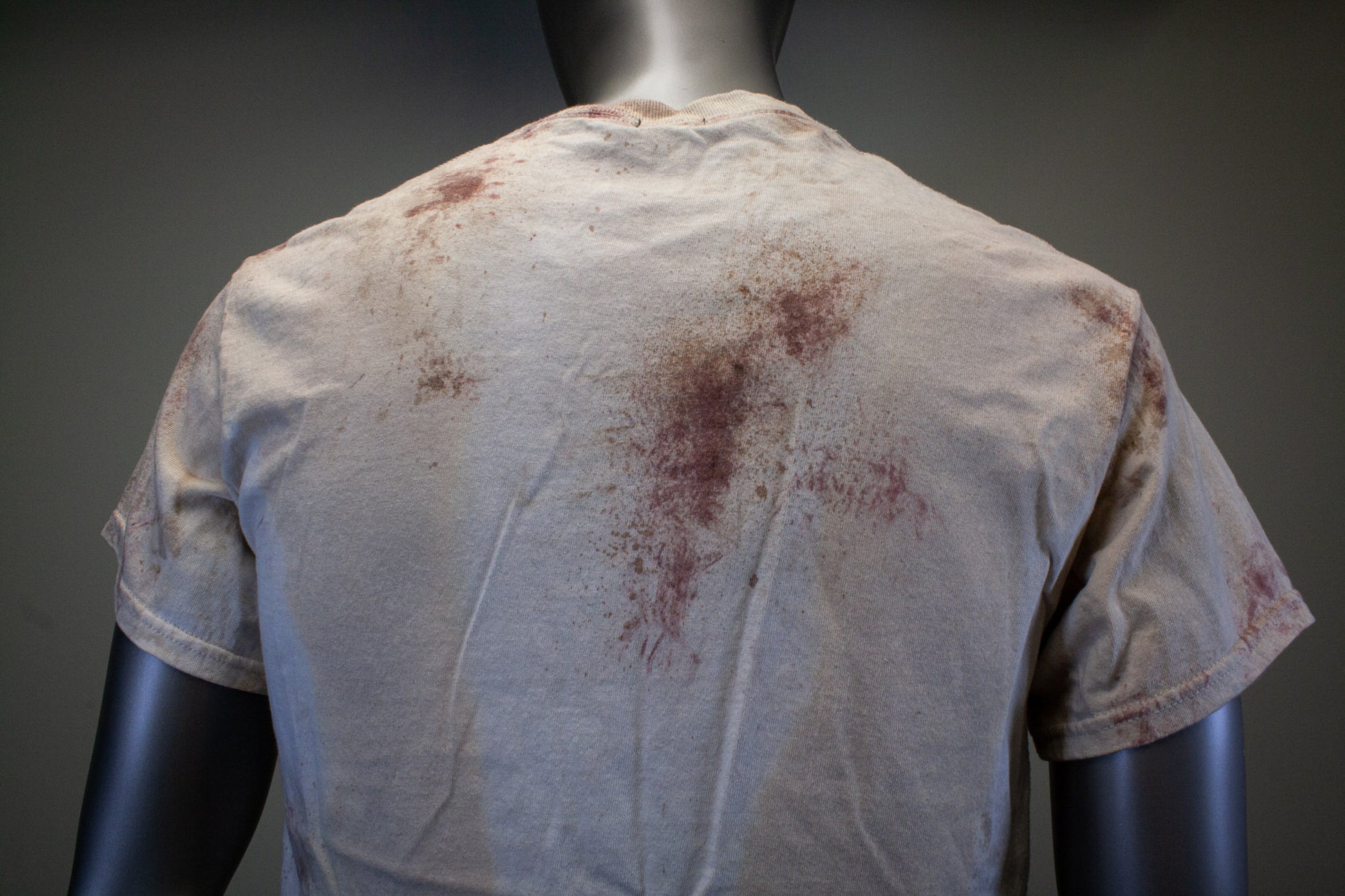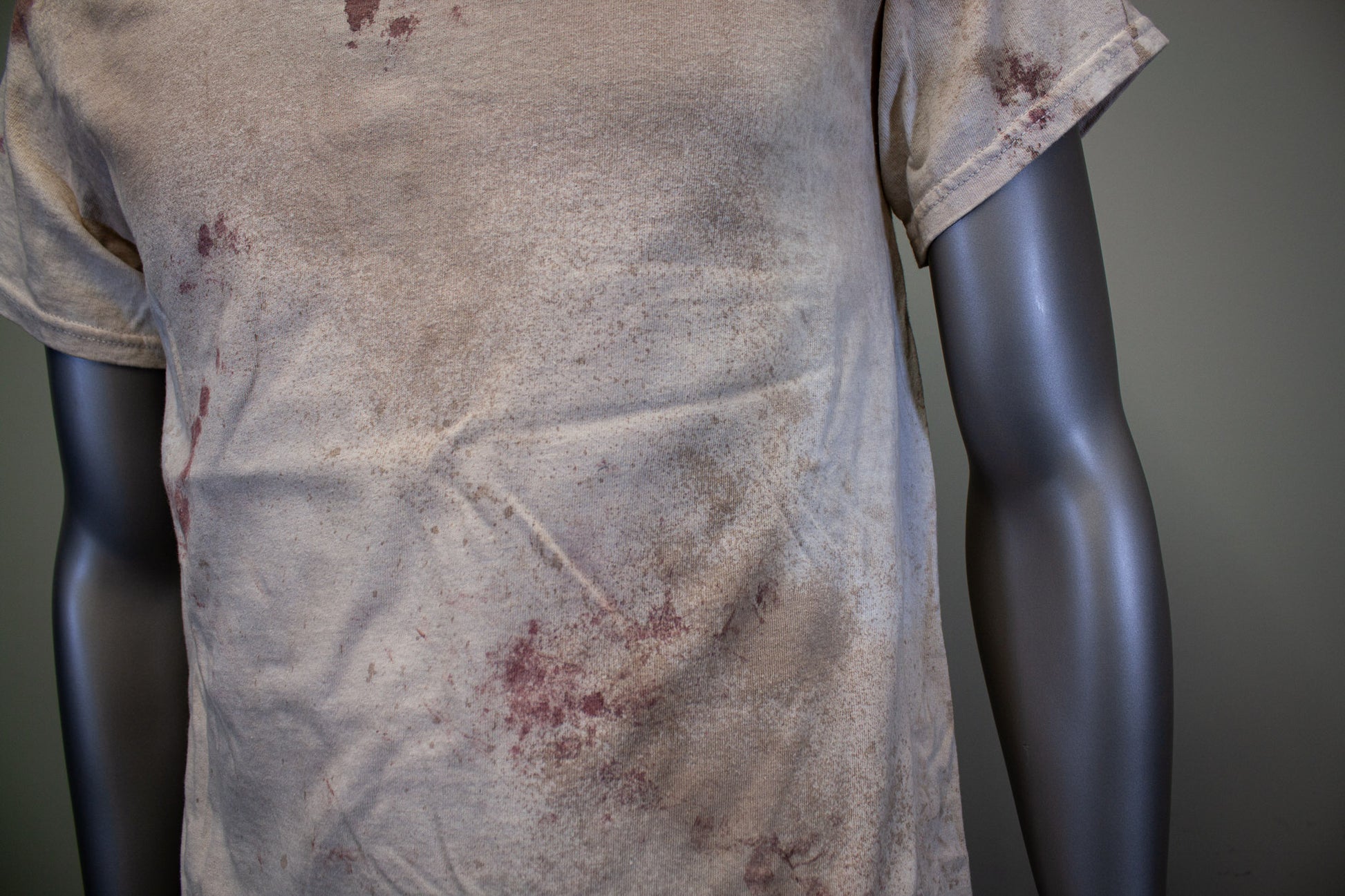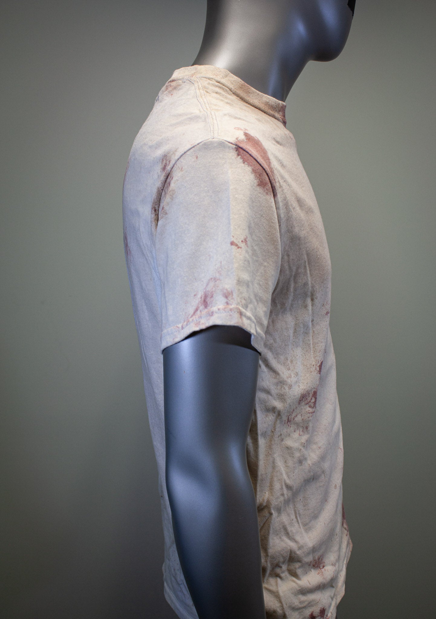 FEELS LIKE A NORMAL SHIRT, NO STAGE BLOOD IS USED; ONLY PIGMENTS, FABRIC PAINTS & DYES, WHICH ARE EMBEDDED INTO THE FABRIC TO APPEAR STAINED.