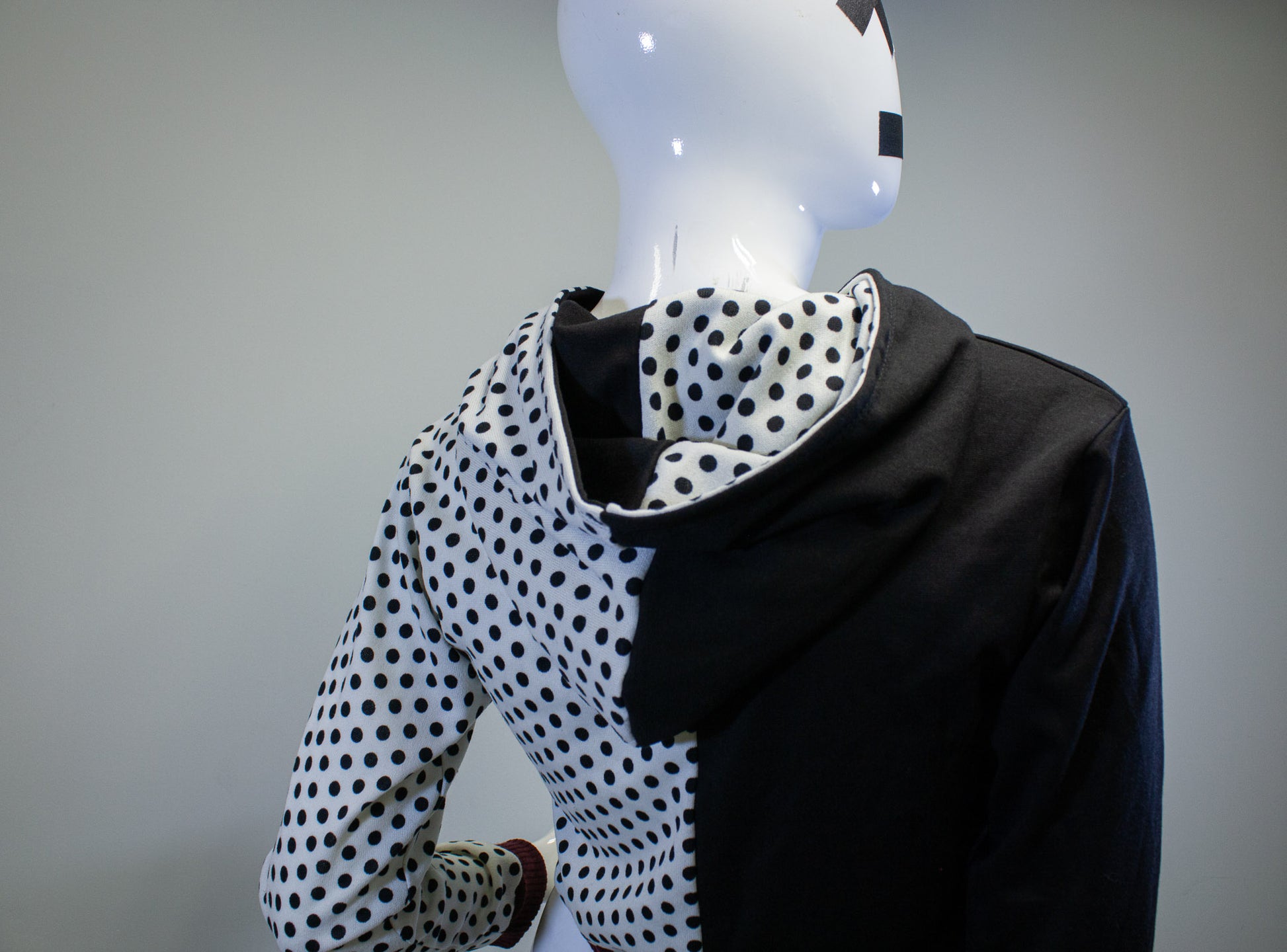MADE WITH A STRETCHY POLY/RAYON/SPANDEX/COTTON BLEND FABRIC IN SOLID BLACK, AND WHITE AND BLACK POLKADOT.