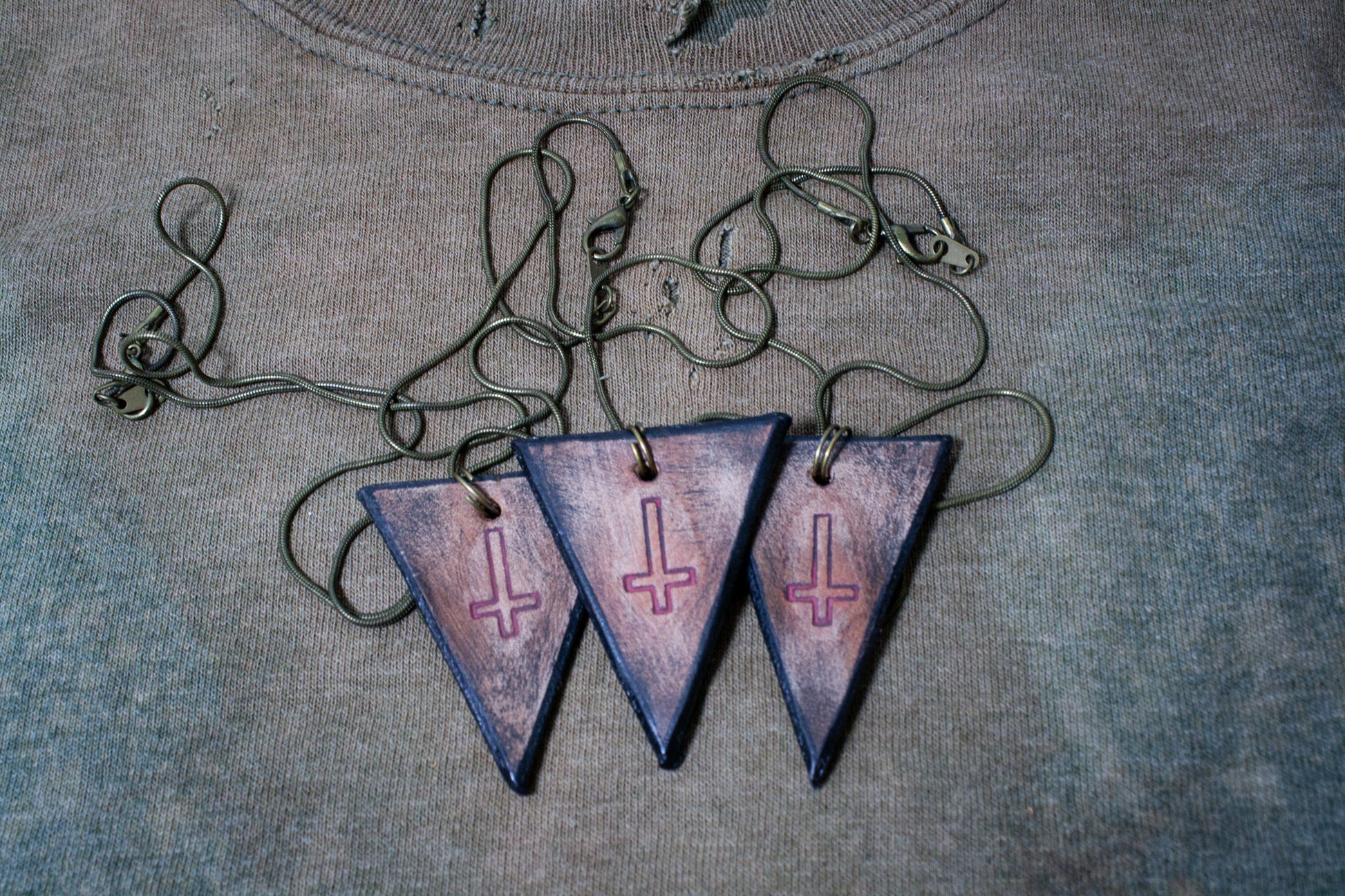INVERTED CROSS, LEATHER EMBOSSED NECKLACE.