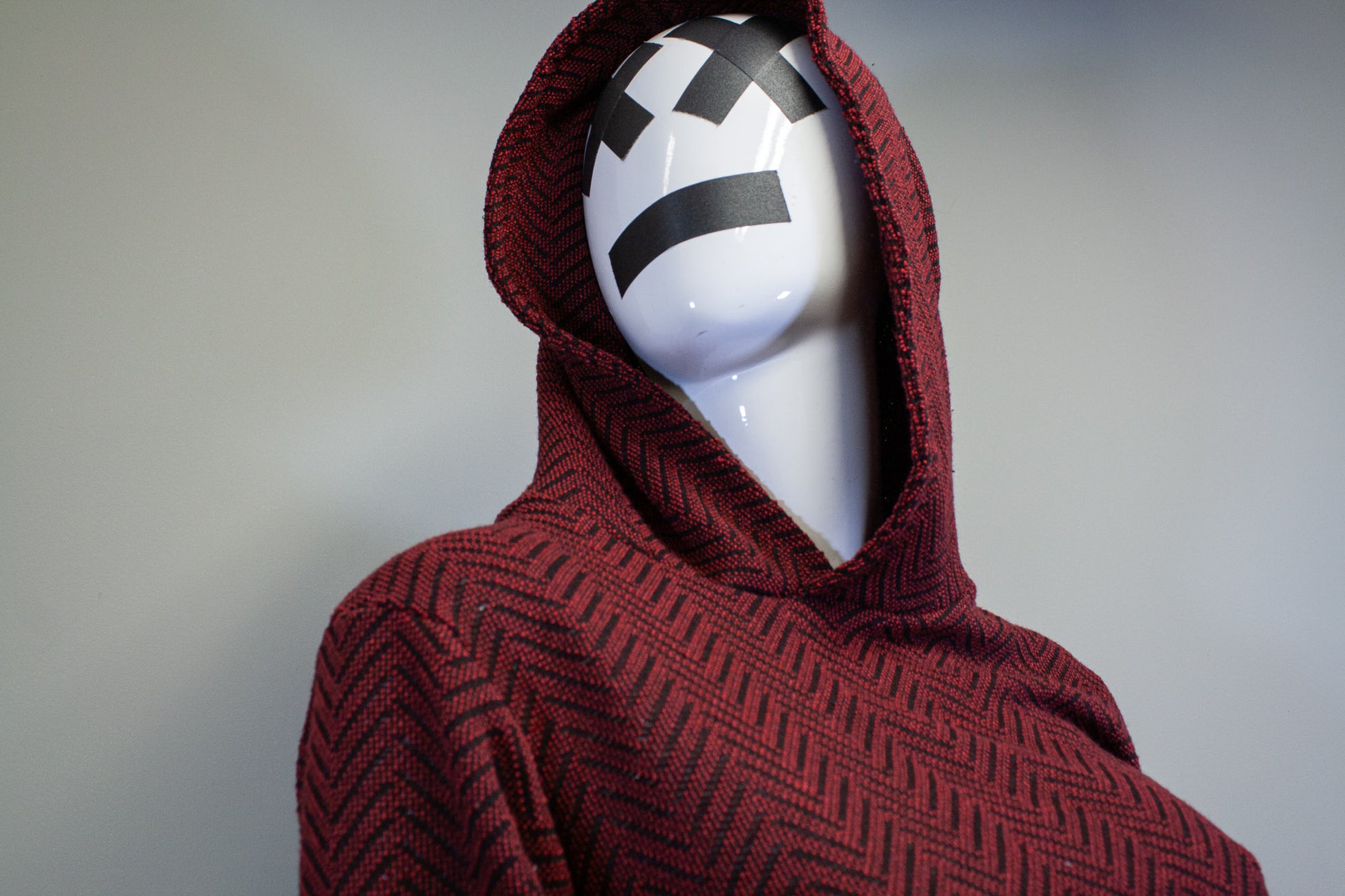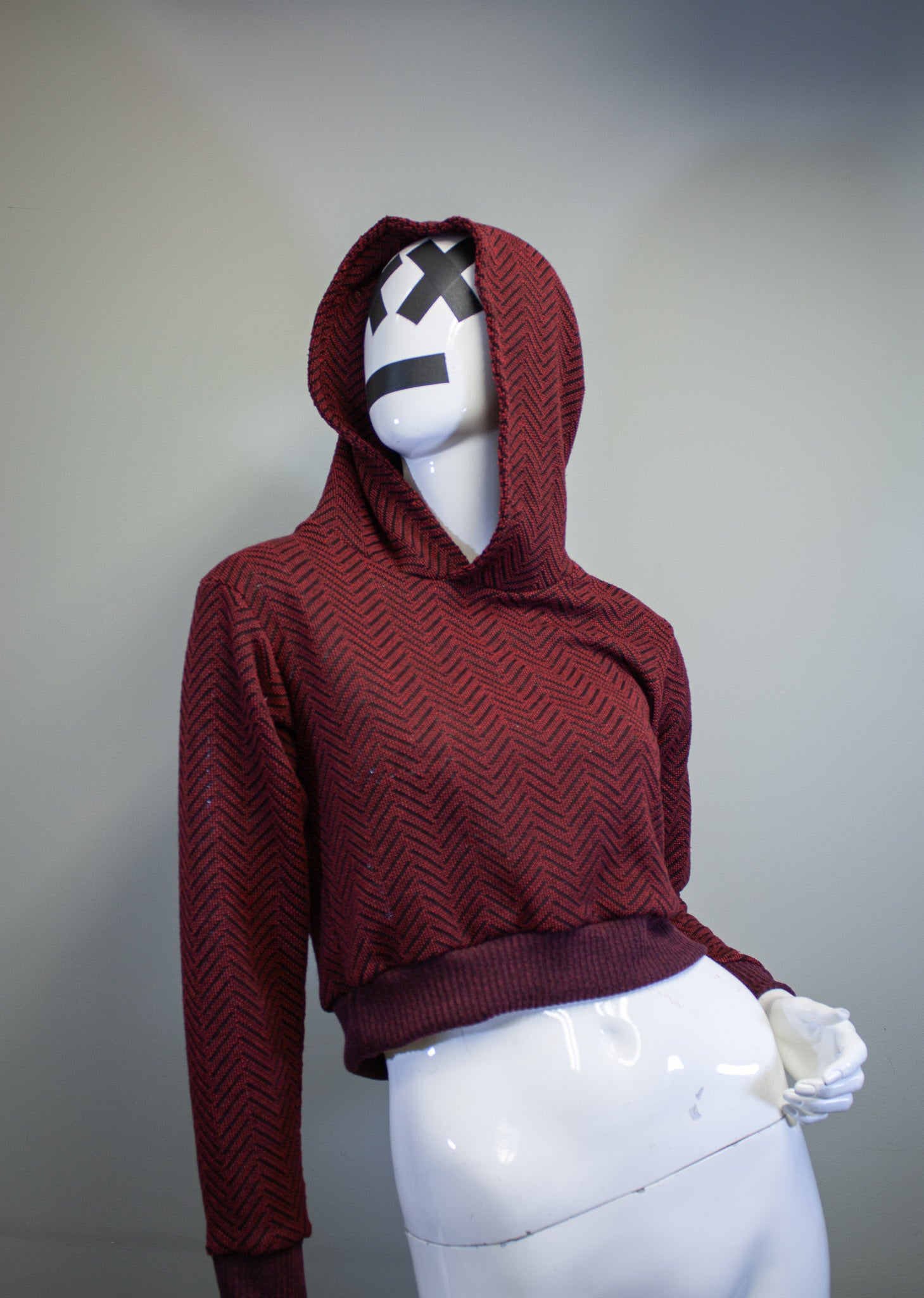 MADE WITH A DEEP RED, HEAVY KNIT FABRIC, WITH SUBTLE BLACK CHEVRON PATTERN.